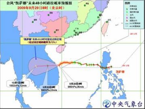 “凱薩娜”的中心29日10時位于越南廣義省以東大約40公里的南海西部海面上,就是北緯15.4度、東經(jīng)109.2度,中心附近最大風力有12級(35米/秒),中心最低氣壓為965百帕。
