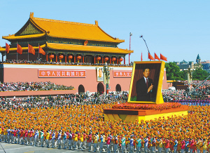 六十年前的“十一”,毛澤東在開國(guó)大典上向世界莊嚴(yán)宣告:“中華人民共和國(guó),中央人民政府,今天成立了!”在新中國(guó)成立六十周年的慶典上,這聲音再次響徹天安門廣場(chǎng)。毛澤東巨幅畫像及“毛澤東思想萬歲”、“中國(guó)人民從此站起來了”兩句標(biāo)語,出現(xiàn)在游行方陣中,似乎將人們帶回到六十年前新中國(guó)開國(guó)大典的振奮時(shí)刻。