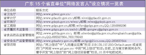 記者從省委辦公廳網(wǎng)絡(luò)信息資源處了解到,目前設(shè)立“網(wǎng)絡(luò)發(fā)言人”的15個(gè)省直部門是:省教育廳、省公安廳、省監(jiān)察廳、省勞動(dòng)和社會(huì)保障廳、省國(guó)土資源廳、省建設(shè)廳、省交通廳、省衛(wèi)生廳、省審計(jì)廳、省環(huán)保廳、省工商局、省質(zhì)量技術(shù)監(jiān)督局、省食品藥品監(jiān)督管理局、省安全生產(chǎn)監(jiān)督管理局、省信訪局!熬W(wǎng)絡(luò)發(fā)言人”的主要職責(zé)是:定期收集處理本單位網(wǎng)站和人民網(wǎng)、南方網(wǎng)、奧一網(wǎng)上留言板或問政平臺(tái)上網(wǎng)友的留言。