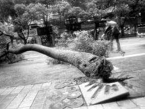 隨后,這棵樹迎風(fēng)墜地,樹根被連根拔起,發(fā)出巨大的砰響聲,周邊的地磚也被鑿裂。當(dāng)記者趕至現(xiàn)場(chǎng)時(shí)看到,這棵大樟樹直徑約有20公分,高約5米。