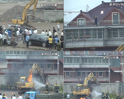九點,潘蓉家的大門被推土機(jī)鑿開,拆遷人員進(jìn)入樓內(nèi),要把潘蓉一家清除出樓房實施拆遷,但是由于潘蓉家里一二層用于出租,三四層還有一個防盜門,所以拆遷人員到了三層以后沒法上樓,雙方隔著門開始叫喊,地面的人開始向四樓扔石塊。氣氛也變得越來越緊張。9點15分,挖土機(jī)開始鑿房屋的外墻,樓下的陽臺被機(jī)器手拍斷,部分墻壁開裂并且傾斜。