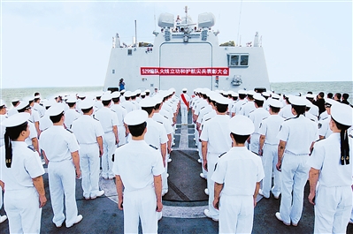 綬帶映紅碧波,掌聲響徹大洋。今天(當?shù)貢r間11月25日)下午4時,中國海軍第三批護航編隊“火線立功和護航尖兵表彰大會”在“舟山”艦飛行甲板舉行。