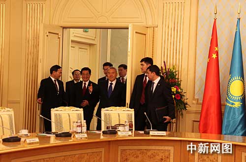 會談前,胡錦濤和納扎爾巴耶夫共同出席中哈天然氣管道竣工儀式。會談后,兩國元首在總統(tǒng)府內見證了雙方合作文件的簽署,并共同會見記者。