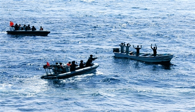 12時09分,中國海軍護航編隊接到求救信號后,迅速進入一級反海盜部署。馬鞍山艦、溫州艦、巢湖艦分別從不同方位向事發(fā)海域高速機動,巢湖艦艦載直升機搭載特戰(zhàn)隊員緊急升空進行搜索查證。