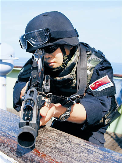 12時28分,巢湖艦在艦載直升機的引導(dǎo)下鎖定了正在轉(zhuǎn)向“鴻達號”商船的疑似海盜快艇。在發(fā)射3枚信號彈予以警告后,疑似海盜快艇被迫停車,隨后趕到的馬鞍山艦迅速派出2艘小艇靠近,特戰(zhàn)隊員將其驅(qū)離。