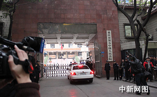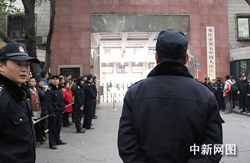 今天一早,中新網(wǎng)記者在重慶市第五中級人民法院門口看到,雖然法院門口沒有荷槍實彈的法警站崗,但法院周邊的警力布控比此前的打黑審判更為嚴密、警力更為密集,記者和旁觀者均禁止靠近法院大門。記者注意到,執(zhí)行任務(wù)的數(shù)十位警察均未佩戴警號。當記者詢問是否與今天受審對象有關(guān)時,一警察以“不好說”作答。