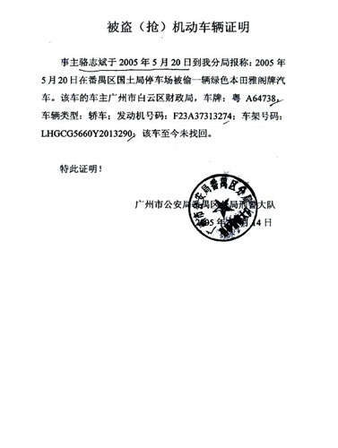 該博文還附了幾張文件的掃描圖作為證明。一張成交日期剛好是2005年5月20日的由番禺區(qū)國土房管局開出的《契稅完稅證》,納稅人為“駱×”,房地產(chǎn)位置為錦繡香江花園××園×街×號;一張六天后廣州市國土房管局開出的同處房產(chǎn)的《房地產(chǎn)權(quán)情況證明》,權(quán)屬人為“駱×”,但備注注明共有人為韓××及駱志斌;一張廣州市公安局番禺分局刑警大隊開出的《被盜(搶)機動車輛證明》(見左圖),上寫駱志斌于2005年5月20日到該分局報案稱,本田雅閣汽車當(dāng)天在番禺區(qū)國土局停車場被盜。網(wǎng)友注明,“駱×”為駱志斌的公子。另外,網(wǎng)友還附了一張房產(chǎn)圖片,稱錦繡香江花園同樣位置的別墅在2006年已賣到每平方米3萬元。