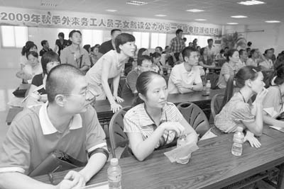 2009年8月26日,福建省廈門市,2009年秋季外來務工人員子女就讀公辦小學派位現場,家長焦急地看著派位結果。廈門市思明區(qū)和湖里區(qū)舉行秋季公辦小學一年級招收進城務工人員子女入學的電腦派位。兩區(qū)共計有3142名進城務工人員子女被派入公辦小學。