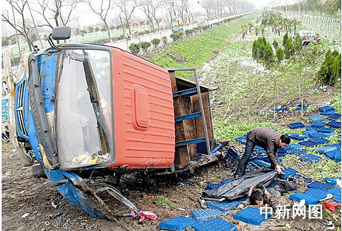在事發(fā)現(xiàn)場,變型拖拉機(jī)已被吊車懸在田埂邊,死者趴在車旁的泥土中,周圍散落著上百只塑料筐及齒輪。距離變型拖拉機(jī)約10米遠(yuǎn)的農(nóng)田里,停著一輛黑色鎮(zhèn)江牌照的轎車,車身有毀損。幾名交警正忙著勘查現(xiàn)場,指揮交通。