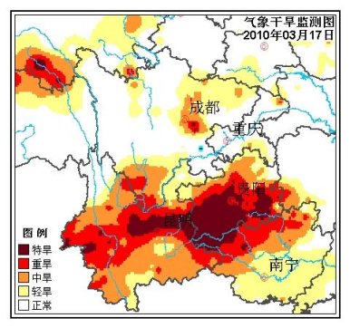 中新網(wǎng)3月17日電 中央氣象臺3月17日繼續(xù)發(fā)布干旱黃色預警:根據(jù)3月17日監(jiān)測,云南大部、貴州中部和西南部、川西高原南部和廣西西北部等地維持氣象干旱重旱等級。18日,云南西北部、廣西東部有小陣雨,未來三天,其余旱區(qū)無降水。云南大部、貴州大部、川西高原南部、廣西西北部等地的氣象干旱將持續(xù)或發(fā)展。