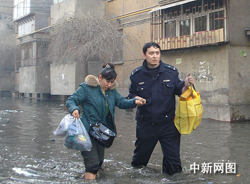 大量的融雪性洪水向倉(cāng)房溝村一帶低洼處涌積,致使土柸結(jié)構(gòu)的居民住房被洪水浸泡,有垮塌之險(xiǎn)。另一處的大量洪水涌入近處一棟居民樓,民警立即組織警力進(jìn)入樓內(nèi)進(jìn)行施救,挨家挨戶動(dòng)員居民撤離住所,并攜老扶幼將婦女兒童帶離危險(xiǎn)地帶。