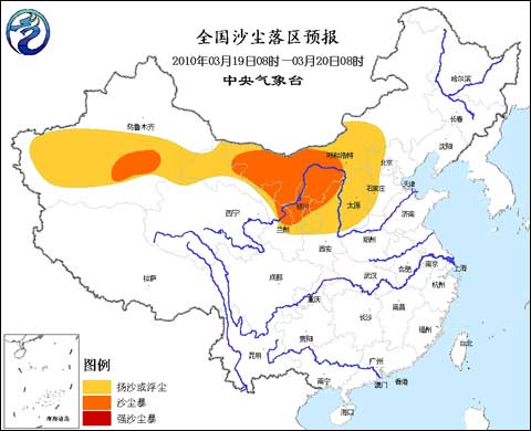 受蒙古氣旋和冷空氣影響,19日08時(shí)至20日08時(shí),南疆盆地、甘肅中西部、內(nèi)蒙古中西部、寧夏、陜西中北部、華北中西部等地有沙塵天氣,其中,南疆盆地東部、甘肅中西部偏北地區(qū)、內(nèi)蒙古西部、寧夏北部、陜西西北部等地的部分地區(qū)有沙塵暴,上述地區(qū)并有5~6級(jí)偏北風(fēng),陣風(fēng)風(fēng)力可達(dá)7~8級(jí)。
