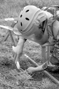 筆者在現(xiàn)場看到,頭戴防護面罩、身穿厚厚的防護服的掃雷作業(yè)手,時而彎著腰用探雷器來回探測,用噴漆或小紅旗做好標示,時而雙膝跪在地上用掃雷專用工具進行挖掘,幾乎是以厘米的進度向前推進。