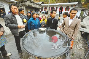 納雍縣少數(shù)民族眾多,這對(duì)新人都是漢族,新郎叫嚴(yán)大朵,新娘叫榮美翼。為了舉行婚禮,半個(gè)多月前,專門在新郎家門口修了一個(gè)水池。全家人都省吃儉用,到處找水存進(jìn)這水池當(dāng)中,村子里其他鄉(xiāng)親也來幫忙。到婚禮舉辦的前一天,兩米見方的水池終于全部裝滿。家里又找了幾口大鐵鍋,裝滿清水備用。