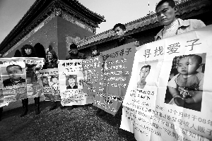 昨日下午2時(shí)許,天壇公園西門附近,10位尋找自己“走失”孩子的父母,舉著大幅的海報(bào),在向過(guò)往的市民介紹著孩子失蹤的情況。海報(bào)上,一張張稚嫩活潑的孩子的面孔與這些中年人憔悴的神情形成了鮮明的反差。