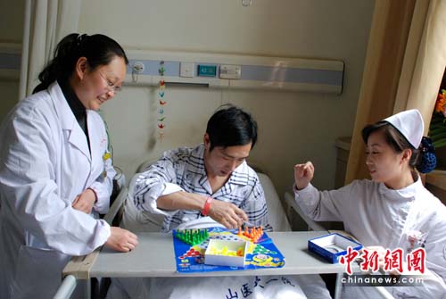 山大一院綜合科的第3病室里,42床的高二輝正在和心理治療師樊艷麗、護士段瑞云下跳棋。