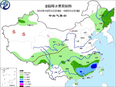中央氣象臺2010年4月12日17時發(fā)布未來三天全國天氣預(yù)報: