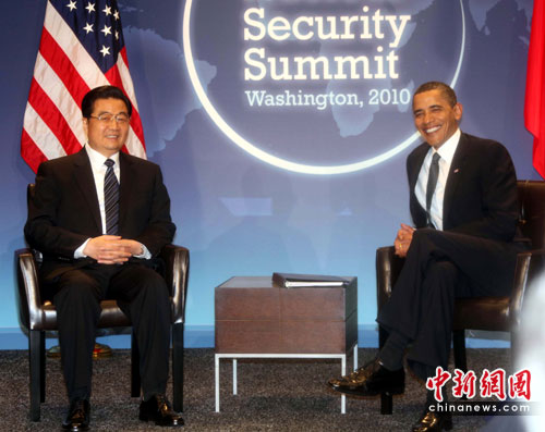 中新社華盛頓4月12日電 (記者 張朔 吳慶才)中國國家主席胡錦濤當(dāng)?shù)貢r間12日下午在華盛頓會見美國總統(tǒng)奧巴馬,雙方就中美關(guān)系及共同關(guān)心的重大國際和地區(qū)問題交換了意見,達(dá)成重要共識。胡錦濤就下階段中美關(guān)系發(fā)展提出5點重要主張。