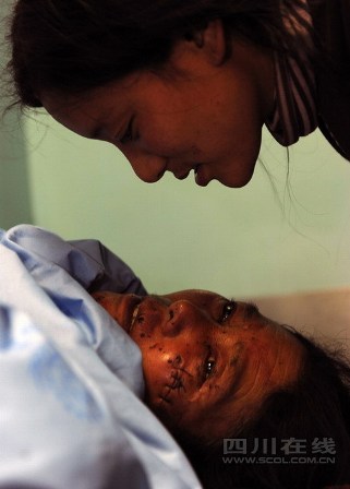 當(dāng)滿載傷員的急救車隊(duì)飛馳在機(jī)場(chǎng)高速時(shí),潘蓮英打開了手機(jī),女兒牟元霞打來電話,“爸爸還好嘛?”“好!我們馬上就到醫(yī)院了!碧稍趽(dān)架上的牟炳學(xué)聽到女兒的問候,再也控制不住自己的情緒,眼淚順著布滿血痂的眼角不停流淌。