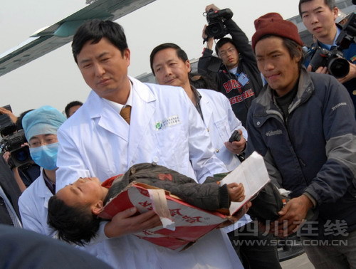 下午5時(shí)10分,空運(yùn)到成都的首名傷員被抬上第一輛救護(hù)車,傷員的口、鼻、眼睛布滿了血痂,手腕、手臂上全是傷痕。抬上擔(dān)架后,隨車主治醫(yī)生余海放立即對(duì)其測(cè)量血壓、心率,詢問有何不適,并進(jìn)行了登記。傷員的右手腕上拴著紅布繩,這是地震災(zāi)區(qū)醫(yī)生經(jīng)過初診后認(rèn)定是重傷員的標(biāo)記。
