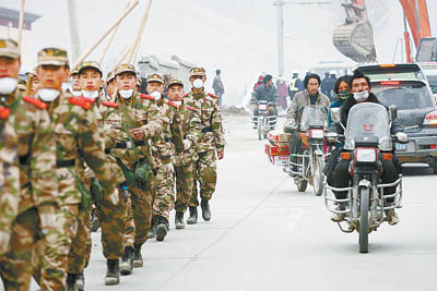 在玉樹(shù),人們正在為不可知的明天儲(chǔ)備一切能得到的東西,包括從廢墟下翻出的一塊還算完整的布料,以及每一個(gè)過(guò)路人手里的蘋果或藥品。想要找到一個(gè)開(kāi)張的鋪?zhàn)訉?shí)在不容易。沒(méi)有倒掉的店鋪緊閉大門。出租車很少愿意停下來(lái)搭客。因?yàn)槿吮纫郧吧倭撕芏,無(wú)家可歸的狗開(kāi)始明目張膽地四處亂竄,對(duì)著行人吼叫。