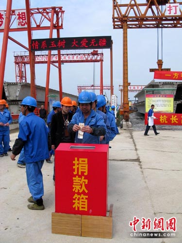 據(jù)杭州市高速公路管理局局長趙益民介紹,青海玉樹地震災(zāi)情發(fā)生后,杭長高速公路杭州段的建設(shè)者們,迅速自發(fā)地開展捐款活動。據(jù)悉,昨天,杭長高速共有10個施工現(xiàn)場舉行了“心系玉樹獻(xiàn)愛心”的捐款活動,近千名民工參加。