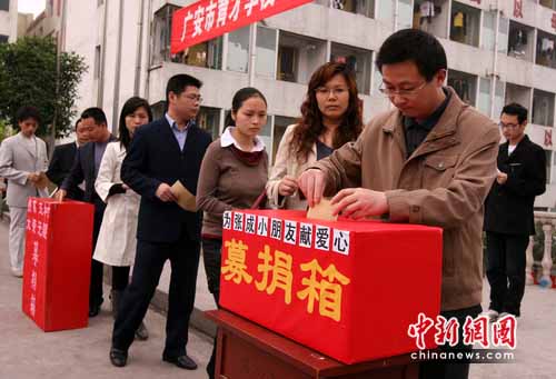 中新網(wǎng)成都4月26日電(廖小兵 王天青 曾一瑩)在“4.14”青海玉樹大地震中,四川廣安區(qū)龍安鄉(xiāng)文林村四組村民張朝清、聶文蘭夫婦雙雙遇難,留下遺孤張成與72歲的奶奶相依為命。消息傳來,愛心如潮,廣安區(qū)各界人士紛紛伸出援助之手。26日8時(shí)許,在廣安城南新區(qū)的育才學(xué)校校園內(nèi),師生們?yōu)榧娂娍犊饽遥?dāng)場(chǎng)收到捐款15100.90元。