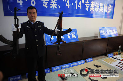 B——4月14日,長沙市公安局雨花分局金桃派出所巡防隊員查獲8支非法販運的槍支,長沙警方在浙江、上海、云南、廣東公安機(jī)關(guān)的協(xié)作下,破獲了一起從境外向“長三角”地區(qū)販運槍支的大案。此案繳獲包括殺傷力極大的M16、AK47突擊步槍在內(nèi)的各種軍用槍支13支、子彈305發(fā),抓獲犯罪嫌疑人7人。