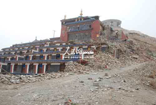 距結古鎮(zhèn)約20公里的禪古寺是該地區(qū)噶舉派最大的寺院,也是地震中損毀最嚴重的寺廟,3個主殿堂損毀兩座,經(jīng)堂全部倒塌,有260間僧房與兩個閉關等也被全部毀壞,更重要的是還有大量佛教用品和珍貴文物埋在廢墟下。