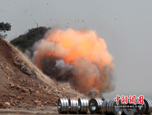 中新網九江4月28日電(胡國林 李濤淵)“一、二、三”,隨著一聲令下,4月27日中午,在江西九江都昌縣磯山湖附近一偏僻的時子山腳下,立即出現(xiàn)一個巨大的“火球”,原來,這里正在實施銷毀日軍侵華時期遺留下來的炮彈。