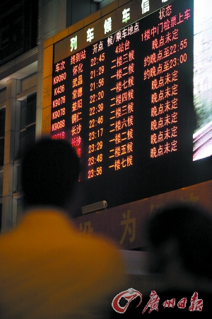 昨晚9時經(jīng)緊急搶修中斷行車3小時的京廣線重新恢復通車。受此影響,當晚7時后從廣州火車站發(fā)出的列車出現(xiàn)晚點,滯留旅客一度擠滿候車大廳。