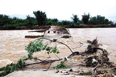 6日下午18時(shí)左右,位于乳源境內(nèi)的國(guó)道323線K426+360處大型涵洞被洪水沖毀,造成路面出現(xiàn)一個(gè)14.5米深的大洞,被毀路基長(zhǎng)90米、路面1000平方米、擋土墻2500立方米,致使交通完全中斷。公路部門(mén)已在現(xiàn)場(chǎng)設(shè)置了安全警示標(biāo)志,并在可繞行路口設(shè)置指示標(biāo)牌,安排人員疏導(dǎo)過(guò)往車輛改道行駛。搶險(xiǎn)隊(duì)經(jīng)研究決定:先在該路段被沖毀的橋涵缺口旁埋設(shè)一條約2米長(zhǎng)的涵管,并力爭(zhēng)用三天時(shí)間完成便道的鋪設(shè)工作,解決暫時(shí)的通車問(wèn)題;待洪水過(guò)后,再在損毀路段新架一座橋梁徹底解決此處通車問(wèn)題。