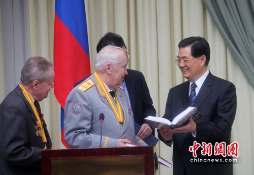 胡錦濤向俄羅斯老戰(zhàn)士們發(fā)表講話,并向他們頒發(fā)“和平”獎(jiǎng)?wù)潞妥C書。