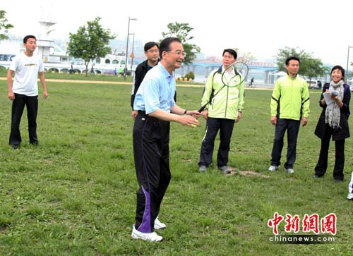 同四人道別后,溫家寶繼續(xù)繞著草坪跑步。跑了兩圈后,他看到草坪上有人在打羽毛球,便走上前去。兩名正在打球的青年男子認(rèn)出了溫家寶,迎過來向他問好。其中一人將自己的羽毛球拍讓給溫家寶,溫家寶與另外一人進(jìn)行了一場“友誼賽”。