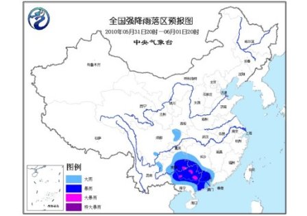 中新網5月31日電 中央氣象臺今日18時發(fā)布暴雨藍色預警:預計5月31日20時到6月1日20時,貴州中東部和南部、湖南西南部、廣西中北部、廣東中西部等地有大到暴雨,其中貴州東南部、廣西中北部等地的局部地區(qū)有大暴雨;上述部分地區(qū)還將伴有短時雷雨大風等強對流天氣。另外,四川盆地東北部、云南東北部等地的部分地區(qū)有大雨。