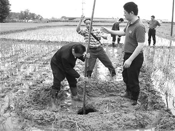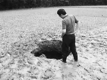 3天后,崇州市懷遠(yuǎn)鎮(zhèn)村民周先生也發(fā)現(xiàn)了一個(gè)“天坑”。周先生說,他路過鄰居家一塊秧田時(shí),秧田里突然噴水,勢如泉涌。水停后,原本好好的秧田竟出現(xiàn)一個(gè)1米多深的“天坑”。