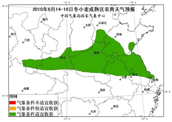 中央氣象臺預計,6月14-16日,陜西南部和關中、山西西南部、河北南部、河南中北部、山東西部和南部、安徽中北部和江蘇麥收區(qū)以晴到多云天氣為主,適宜冬小麥收獲晾曬和夏播作物播種。