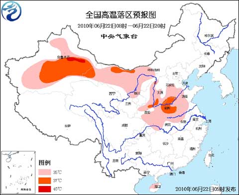 中央氣象臺2010年6月22日06時繼續(xù)發(fā)布高溫藍(lán)色預(yù)警:
