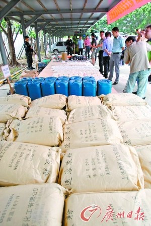 據(jù)警方介紹,早在1999年潘某斌就因?yàn)榉欠ǔ钟卸酒仿辄S素,被內(nèi)蒙古警方抓獲,并獲刑10年。2003年被釋放后來(lái)到廣州,開(kāi)始了更猖狂的販毒。為了掩人耳目,潘某斌開(kāi)起了化工門(mén)市部,租了整棟樓,里面都放著化工原料,