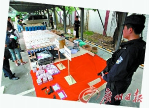 4月22日,東莞市公安局在省公安廳統(tǒng)一指揮和陜西警方的支持下,破獲“330A”特大武裝制販毒案件,抓獲潘某斌等犯罪嫌疑人15名,搗毀制毒工場(chǎng)1個(gè),繳獲K粉約246千克、冰毒約8千克、麻古約33千克、制毒原料羥亞胺1025千克,查獲美式制式手槍和仿64手槍各1支、子彈31發(fā),扣押毒資人民幣250多萬(wàn)元,作案車(chē)4輛。