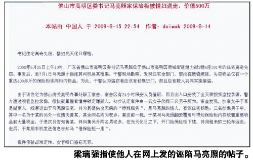 本報(bào)記者從權(quán)威人士處核實(shí),梁瑞強(qiáng)涉嫌的誣告陷害罪,與去年8月在網(wǎng)絡(luò)上舉報(bào)高明區(qū)委書記馬亮照的網(wǎng)帖有關(guān)。當(dāng)時(shí),在天涯、貓撲等知名論壇,不斷有人發(fā)帖稱馬亮照的宿舍一次就被洗劫500多萬元財(cái)物,違規(guī)使用專用賬戶資金等等,一時(shí)掀起軒然大波。警方立案調(diào)查背后的始作俑者,卻發(fā)現(xiàn)幕后黑手竟然是副區(qū)長(zhǎng)梁瑞強(qiáng)。