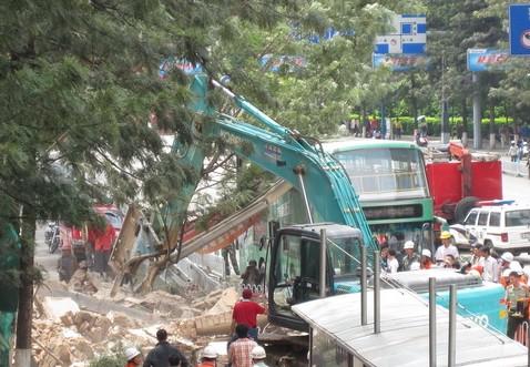 記者現(xiàn)場了解到,今天上午11時15分左右,云南飯店在拆遷過程中突然發(fā)生倒塌。靠東風(fēng)西路一邊正在被拆遷的一堵高大約7米的墻體砸向公交站臺,一輛5路公交車正在站臺上下客,由于墻體離公交站臺非常近,正在下車的兩名乘客(一男一女)被砸傷。隨后,救護車迅速趕往現(xiàn)場,目前,兩名傷者均已被送往醫(yī)院搶救,傷勢尚不清楚。
