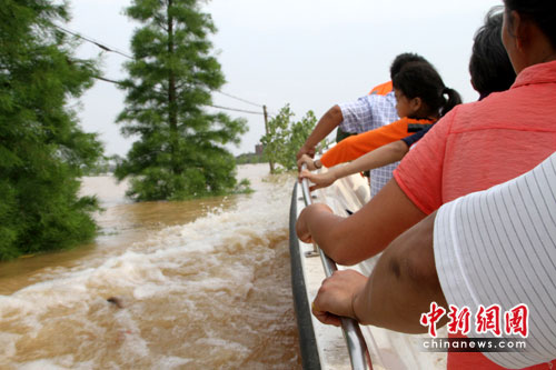 中新網(wǎng)臨川6月23日電(艾永全 何柳斌 劉占昆)撫河唱?jiǎng)P決堤進(jìn)入第三天,23日下午,中新社記者重返重災(zāi)區(qū)羅針鎮(zhèn),天空開(kāi)始稀稀疏疏的下著小雨,福銀高速兩旁汪洋一片,沖鋒舟馳騁在洪水當(dāng)中解救被困群眾。由于大部分村民已經(jīng)撤離,各地紛紛建立“護(hù)村隊(duì)”巡防保護(hù)村子安全。