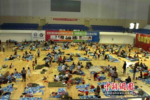 體育館內(nèi)鋪滿了被褥、涼席,有些老人和小孩還正在睡覺。有的床位已經(jīng)空出來,工作人員介紹,這些人大多轉(zhuǎn)投親友去了。記者發(fā)現(xiàn),盡管體育館內(nèi)人很多,但一點(diǎn)也不嘈雜,很多人就躺在被子上,靜靜地望著十幾米高的天花板。