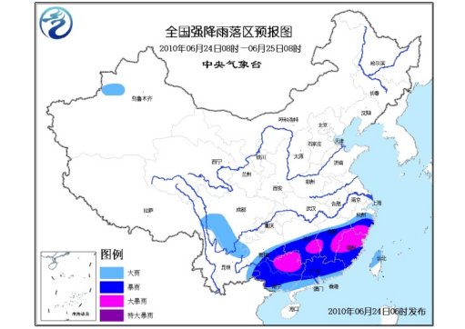 中新網(wǎng)6月24日電 中央氣象臺24日6時繼續(xù)發(fā)布暴雨黃色預警:預計,6月24日8時到6月25日8時,貴州南部、湖南中南部、江西大部、浙江中南部、福建、廣東大部、廣西等地有大到暴雨;廣西東北部、湖南東南部、江西中部偏東和中部偏西、浙江南部、福建中北部等地的部分地區(qū)有大暴雨。