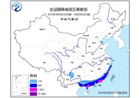 中新網(wǎng)6月25日電 中央氣象臺今日18時發(fā)布暴雨藍色預警:預計,6月25日20時到6月26日20時,浙江東部、福建東部和南部、廣東大部、廣西中南部、臺灣大部有大雨或暴雨,局地有大暴雨;上述部分地區(qū)并伴有短時雷雨大風等強對流天氣。另外,云南東北部的局部地區(qū)有大雨。