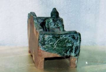 1、床:該床尺寸:長(zhǎng)20.5cm,高:14cm,寬:12cm。從造型看漢代床的特征極為明顯。該床由三部分組成:床板,邊框,支架。該床為厚板與邊框護(hù)板相連。床面上刻有幾何形方格紋,又稱錢眼紋,泉源紋,即,古銅錢中心方孔紋飾。寓意睡臥錢眼,后輩有錢。床上邊框?yàn)樽、后、右三面高護(hù)板組成。后護(hù)板中高、兩低。每塊護(hù)板上模印草花。寓意草繁茂盛。床板與邊框護(hù)板相連放在四腿支架上。四腿支架前后又有護(hù)板。前護(hù)板上三個(gè)方格內(nèi)有卷草模印圖案,后護(hù)板無(wú)釉無(wú)紋為黃泥土胎。