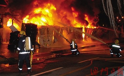 澳門一舊輪胎回收場發(fā)生大火,多隊消防員向火場噴灑化學泡沫及射水。(圖片來源:澳門日報)
