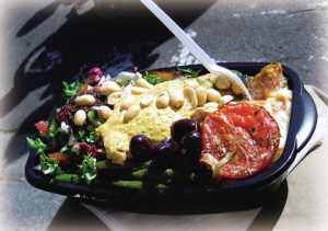 五谷雜糧和全麥谷物對(duì)健康的重要性不在話下,也是地中海地區(qū)人民常攝取的食物。希臘有風(fēng)行地中海地區(qū)的PITA面包,搭備面包的沾醬更是多采多姿,當(dāng)?shù)刈钪恼瘁u,幾乎都是以新鮮蔬菜加上橄欖油或優(yōu)格調(diào)制而成,讓人可嘗到時(shí)蔬的鮮脆滋味。新鮮蔬果不虞匱乏的希臘,此地人民看待蔬菜、水果不僅止于配菜或盤飾,而是將其營(yíng)養(yǎng)與美味發(fā)揮至極致,如蕃茄、青椒、洋蔥、茄子、小黃瓜、蔾豆、西洋芹、大蒜等,都是入菜的好材料,有了這些鮮活佐料,更讓希臘美食增色不少!此外,以油、醋腌漬的各式蔬菜、橄欖,希臘人稱之為MEZEDES,則是小酒館里常見的下酒菜。得天獨(dú)厚的希臘三面環(huán)海,擁抱海洋的恩惠─海鮮并不難,豐富的新鮮漁獲如魚、蝦、蟹、干貝、蛤蜊等,可輕易變化餐桌上的菜色。另外,隨處可見的干果零嘴攤販,擺滿花生、杏仁果、開心果、無花果、葡萄干等干果,最能展現(xiàn)希臘的街頭風(fēng)情。