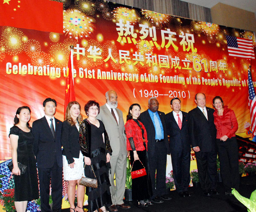 楊國強在致辭中回顧了中國建國61年來取得的重大成就。他說,中國保持持續(xù)、健康、快速發(fā)展的良好勢頭,經(jīng)濟社會各項事業(yè)穩(wěn)步推進,綜合國力不斷增強,國際地位日益提高。中美互利合作的友好關系為美國中西部和中國提供了巨大的機會。到去年底,有70個中國公司來到美國中西部開展業(yè)務,投入近三億美元。在中西部,大約有三萬名學生現(xiàn)在學習中文,這里已經(jīng)建立了15所孔子學院供人們學習中國文化和語言。